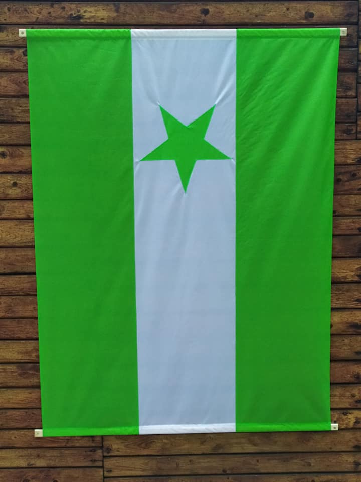 Starou, zeleno-bílou vlajku s hvězdou nám roztrhal vítr. Požádali jsme tedy šikovnou krejčovou Jarku Koudelovou, zda by nám ušila novou 🙂